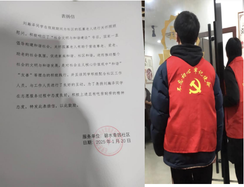 JG-315团队的刘瀚泽同学在石家庄市碧水青园社区积极参与关爱老人的志愿服务活动,响应“社会文明与和谐建设”号召。他配合社区工作人员,为老人送去温暖与关怀,践行了“和谐”“友善”的社会主义核心价值观。此次活动不仅让老人们感受到社会的关爱,也增强了社区凝聚力,弘扬了“老吾老以及人之老”的传统美德,展现了志愿者的奉献精神。