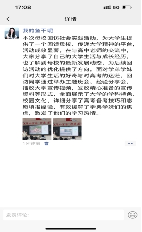 本次母校回访社会实践,团队展现出了极高的热情与责任感。准备充分,提前与学校沟通协调,,讲述了大学生活的丰富多彩以及本校的优势学科和招生政策。在与学弟学妹交流过程中,形式多样,既有精彩的主题演讲,又有轻松的互动答疑,有效激发了学生对大学生活的向往,为母校和本校搭建起了一座沟通的桥梁,成效显著。