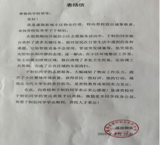 于制伯同学表示,能得到居民们的认可,深感荣幸,这离不开大家的支持与配合。未来,他会坚守初心,积极探索更多服务方式,凭借更贴心的关怀、更周到的行动,为小区居民带来更多温暖,为社区建设添砖加瓦,让这份温暖与责任在小区延续。