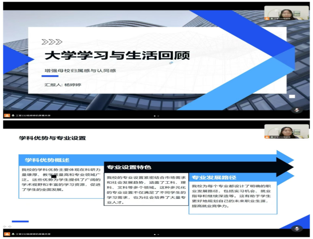 杨婷婷同学与付明琪同学采取线上交流的方式进行了母校回访。杨婷婷同学与母校依安县实验中学王老师进行了交流,付明琪同学与母校齐齐哈尔市恒昌中学张老师进行了线上交流,她们向老师表示了感谢,探讨学校的变化,并给学弟学妹们提出了建议,给学弟学妹们讲述大学里发生的趣事与很多经验,向学弟学妹介绍团队合作能力的提升途径,以及课外活动类型的选择及建议。