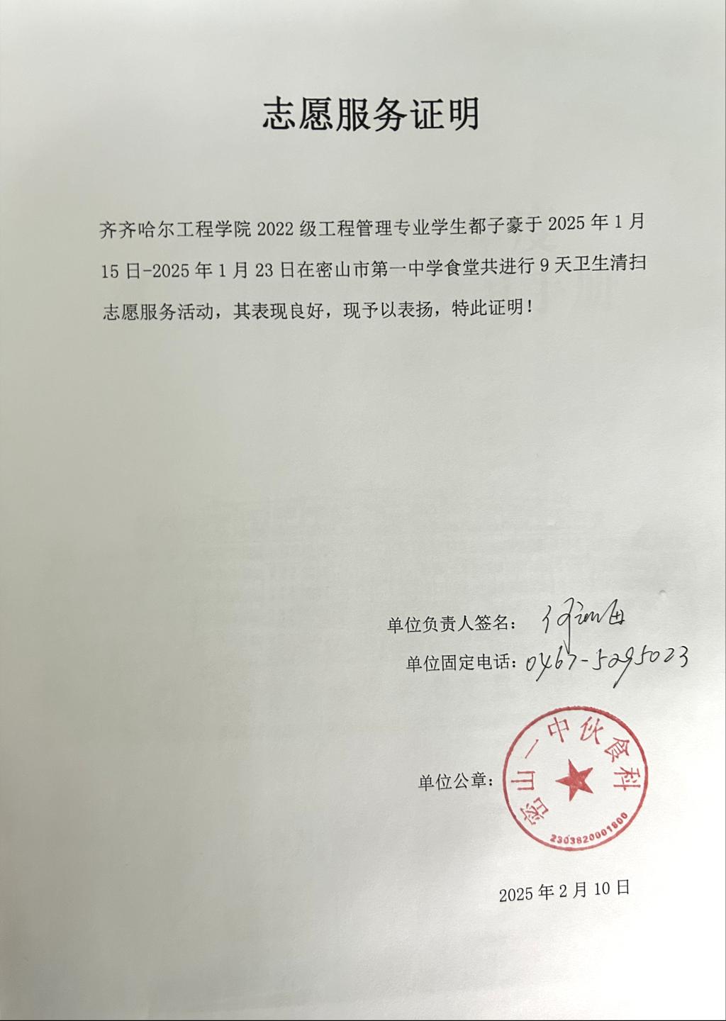 为践行劳动教育理念,弘扬志愿服务精神,1月15日至23日,工管221班都子豪同学回到母校密山市第一中学开展“洁净校园·青春行动”志愿服务活动。