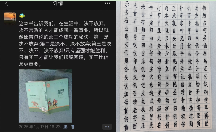 阅读启智,书香润心。在社会实践学期,都子豪同学通过阅读《鲁宾逊漂流记》,深刻体会到了坚持不懈、永不言败的意义。我们面前无困难,困难面前有我们,只为成功想办法,不为失败想理由,作为齐工程学子,要时刻发挥我校的亮剑精神。通过此次活动,提升了学生的汉字书写能力和政治鉴别能力,同时也充分认识到亮剑精神的重要性。为今后步入社会,在工作岗位上发光发彩坚定基础。