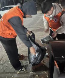 第二天,陈汝军帮助社区工作人员清洁街边掉落的垃圾和帮忙倒掉垃圾桶里的垃圾,并且帮助社区招待人们提供操作指示服务。
