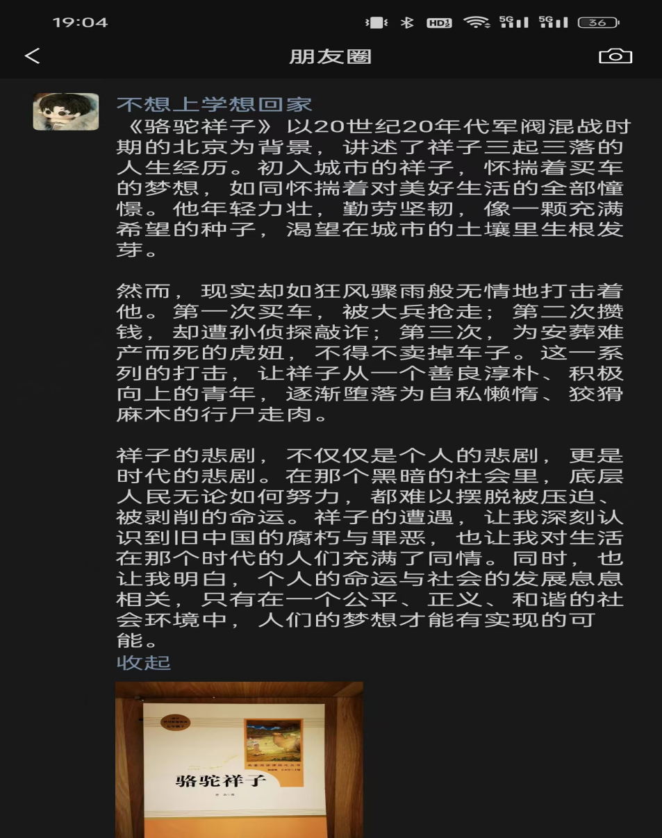 土木232 黄柔雪:读完《骆驼祥子》这本书,我感受到不仅仅是个人的悲剧,更是时代的悲剧。在那个黑暗的社会里,底层人民无论如何努力,都难以摆脱被压迫、被剥削的命运。祥子的遭遇,让我深刻认识到旧中国的腐朽与罪恶,也让我对生活在那个时代的人们充满了同情。同时,也让我明白,个人的命运与社会的发展息息相关,只有在一个公平、正义、和谐的社会环境中,人们的梦想才能有实现的可能。