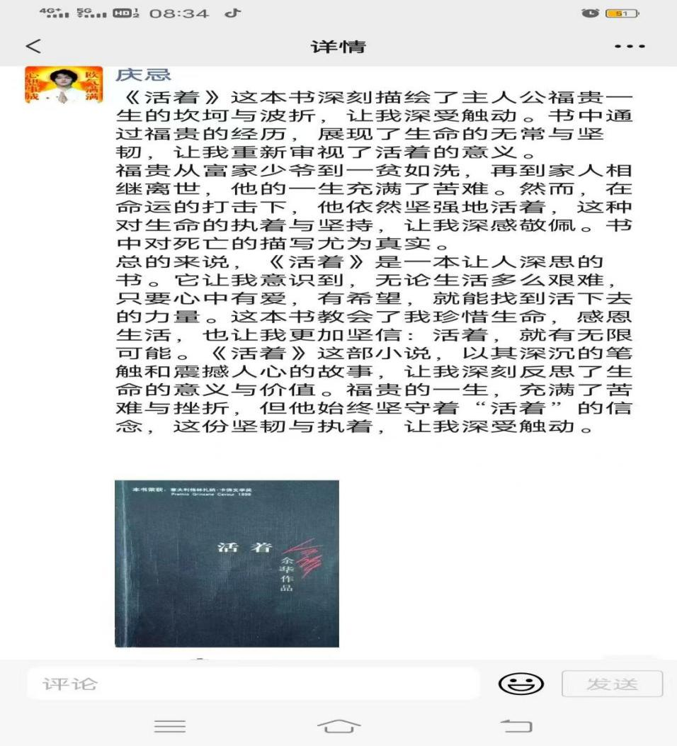 工管232班 刘盈盈:《活着》这本书深刻描绘了主人公福贵一生的坎坷与波折,让我深受触动。书中通过福贵的经历,展现了生命的无常与坚韧,让我重新审视了活着的意义。