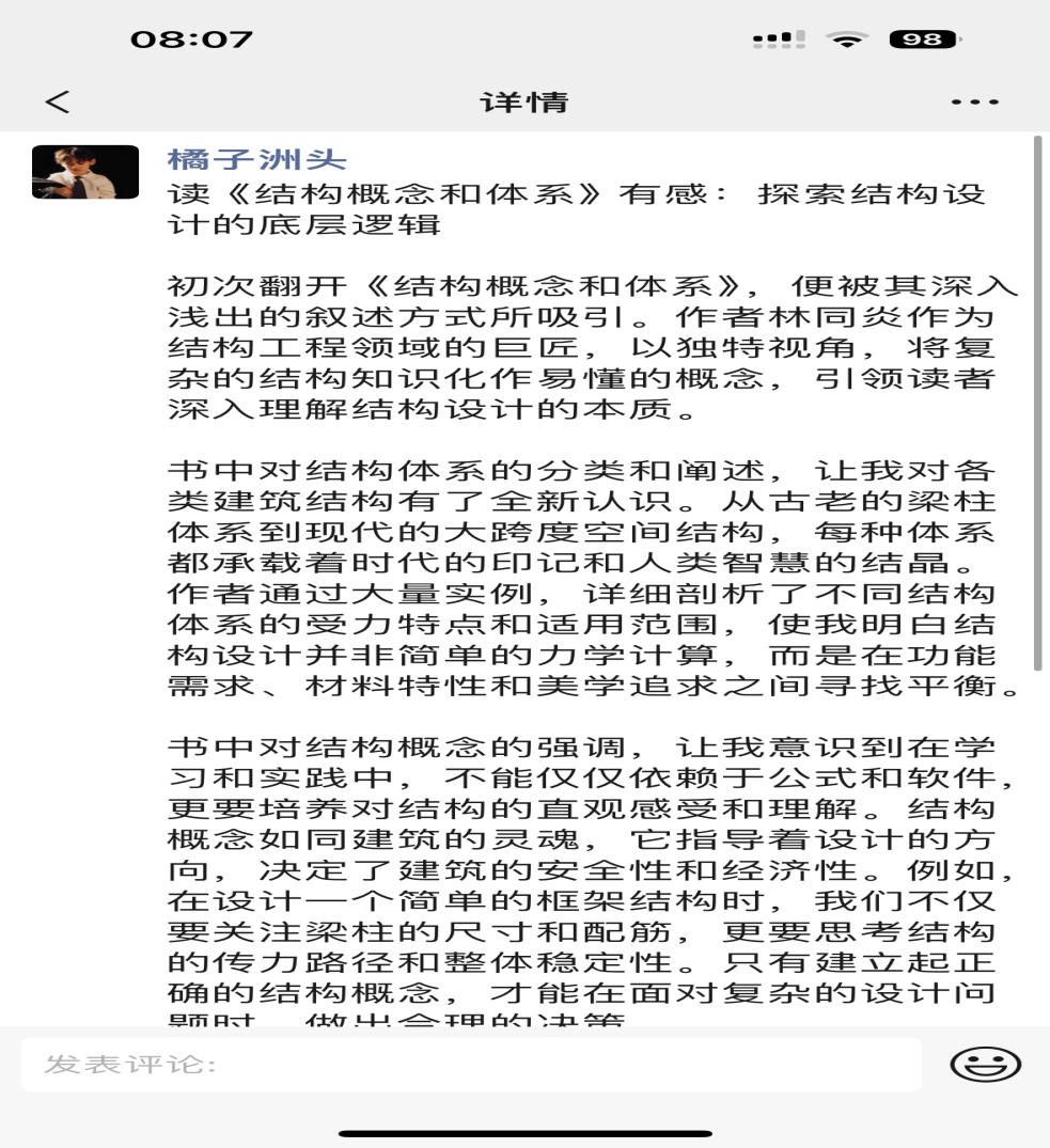 土木232班 马丰:书中对结构体系的分类和阐述,让我对各类建筑结构有了全新认识。从古老的梁柱体系到现代的大跨度空间结构,每种体系都承载着时代的印记和人类智慧的结晶。作者通过大量实例,详细剖析了不同结构体系的受力特点和适用范围,使我明白结构设计并非简单的力学计算,而是在功能需求、材料特性和美学追求之间寻找平衡。