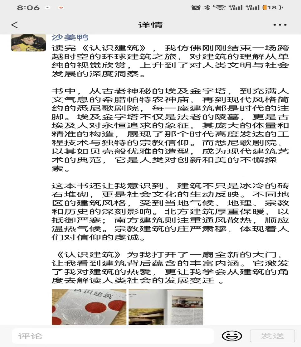 土木232班 孙佳媛:读完《认识建筑》,我仿佛刚刚结束一场跨越时空的环球建筑之旅,对建筑的理解从单纯的视觉欣赏,上升到了对人类文明与社会发展的深度洞察。书中,从古老神秘的埃及金字塔,到充满人文气息的希腊帕特农神庙,再到现代风格简约的悉尼歌剧院,每一座建筑都是时代的注脚。埃及金字塔不仅是法老的陵墓,更是古埃及人对永恒追求的象征,其庞大的体量和精准的构造,展现了那个时代高度发达的工程技术与独特的宗教信仰。而悉尼歌剧院,以其如贝壳般优雅的造型,成为现代建筑艺术的典范,它是人类对创新和美的不懈探索