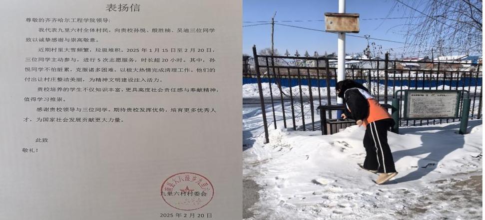 2月21日,工管221班的孙悦、殷胜楠、吴迪三位同学积极响应号召,前往黑龙江省佳木斯市桦南县大八浪乡九里六村,开展了一场意义非凡的志愿服务活动。她们用自己的实际行动,为乡村的建设添砖加瓦,赢得了当地村民的一致好评与表扬。