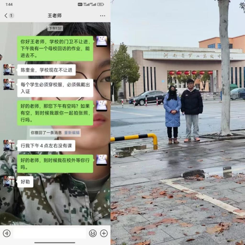 1月23日,土木232班陈奎金同学,怀着对母校的深厚情感,进行母校回访。然而,由于当前校园管理规定的限制,未能如愿进入校园内部与学弟、学妹们交流分享。尽管如此,他依然在校门口与昔日的王老师进行了亲切地交流。