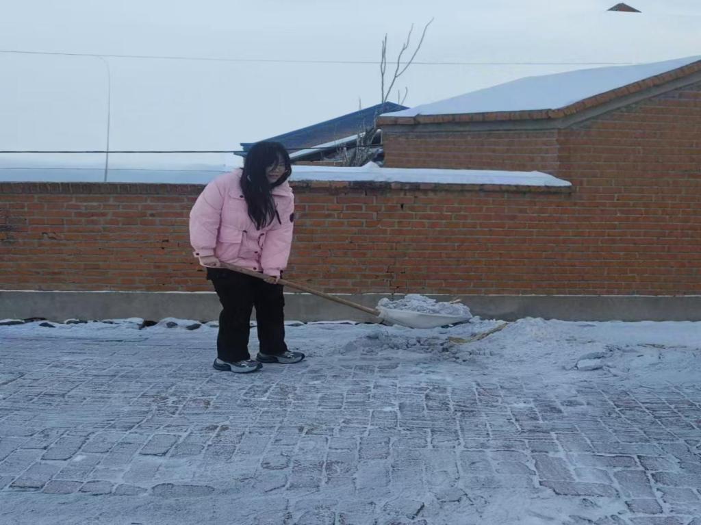 各小组按照分配区域进行扫雪,将积雪堆放在不妨碍交通和村民生活的空旷地带,完成扫雪任务后,向活动负责人报告,由负责人组织检查验收。使王法悦同学切实得到锻炼,提升了劳动精神培养。