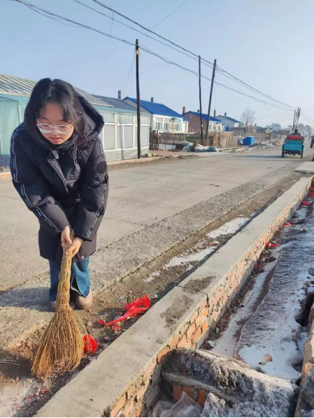 2月16日,风景221班刘禹彤在黑龙江省双华村开展关爱老人志愿服务。她负责帮老人打扫卫生,整理内务,让老人们有一个整洁干净的生活环境。
