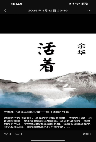 安俊淇表示:合上《活着》,福贵的坎坷人生如在眼前。从富贵到落魄,亲人接连离世,命运待他极苦。可他没有被打倒,在苦难中默默承受,顽强活着。这让我明白,生活常有波折,无论处境多艰难,都要珍惜生命,心怀希望,不轻易言弃,用力走过风雨。