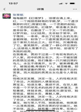 张育航表示:《红楼梦》像一面镜子,照见世间百态。荣宁二府的兴衰,是封建家族盛极而衰的缩影;宝黛钗的情感纠葛,写尽爱情的无奈与人性的复杂。书中满是对封建礼教的批判,读来让人感叹命运无常,也对那个时代的社会风貌有了深刻洞察 。
