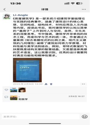周朝阳表示:学习《房屋建筑学》,就像推开建筑世界的大门。从建筑功能分区到空间组合,从基础构造到屋顶形式,我逐渐明白一栋栋建筑背后的设计逻辑与建造智慧。它让我懂得,建筑不仅是遮风挡雨的空间,更是融合美学、技术与生活需求的艺术结晶 。