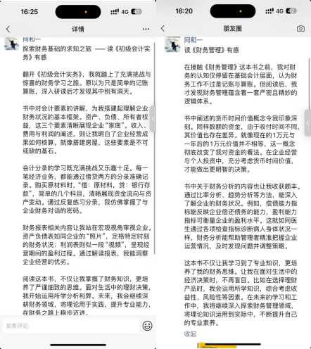在阅读方面,朱奕同此前对财务工作认知局限于记账算账。研读《初级会计实务》后,书中会计要素讲解为她搭建起理解企业财务的框架,会计分录与财务报表知识,让她掌握财务知识,培养了严谨思维。而《财务管理》更是提升了她的财务认知,货币时间价值概念改变了她对资金的看法,财务分析内容助她精准把握企业运营,还培养了其财务思维,使其经济决策更理性。这体现出财务知识学习能深化思维、提升素养,助力生活决策。