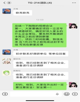 土木与管理学院尤彤彤小组于1月4日上午11点通过视频会议召开团队学习计划落实会,将专业调研、时间胶囊两大任务的推进节点与分工明确到人。会后团队群内反响热烈,已有三名成员完成调研企业初步对接,其中鄢欣悦、陈敏松已敲定走访调研安排,并且土木232班鄢欣悦已确定调研主题为“装配式内装技术发展对土木工程室内项目施工的影响调研”,成为团队实践推进的先行范例。