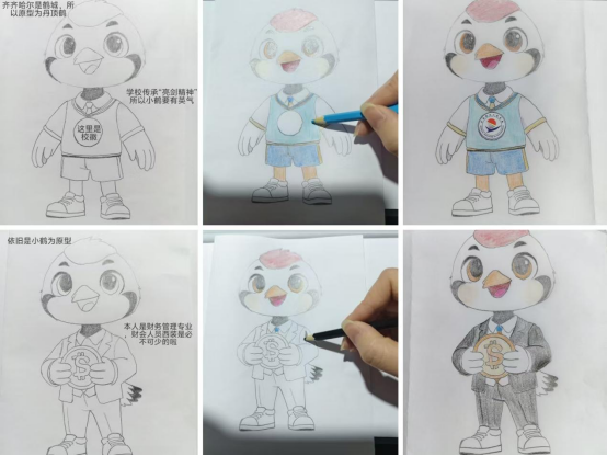 小组同学结合其齐齐哈尔地域特色、校园文化与财务管理专业特点,借助AI工具完成两款吉祥物设计:学校吉祥物通过英姿勃发的丹顶鹤来彰显学校的“亮剑精神”;专业吉祥物则在学校吉祥物的基础之上添加西装、金币等元素,突出财务管理专业特点。