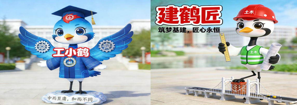 本次设计参考原研哉《设计中的设计》“文化融合”理念与程大锦《建筑:形式、空间和秩序》中建筑结构设计的核心逻辑,以齐齐哈尔城市象征丹顶鹤为核心元素设计校园吉祥物“工小鹤”采用科技蓝主色调,融入校徽齿轮纹理,脚踩“中而至庸,和而不同”校训祥云底座,诠释工科院校的创新与实践精神,设计土木工程专业吉祥物“建鹤匠”则以红安全帽、绿工装马甲为标识,搭配绘图尺、钢筋模型等元素,凸显专业“结构稳固、匠心筑造”的特质。