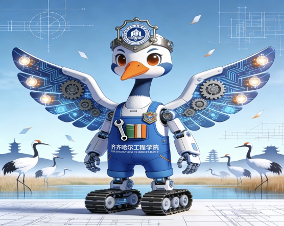 本次吉祥物设计紧扣学校地域特色、工科属性与办学精神,以齐齐哈尔市市鸟丹顶鹤为核心原型,融合机械科技元素,打造出兼具地域辨识度与校园专业特色的卡通形象,旨在彰显学校工科优势,传递勇于创新、实践实干的校园文化。