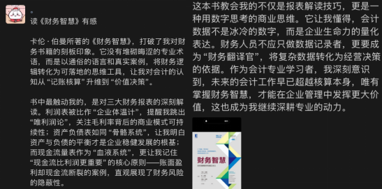 小组成员杨蝶聚焦基础经典教材《会计学原理》,带来了兼具实用性与逻辑性的解读。她针对会计科目设置、复式记账法、财务报表编制等核心知识点,结合日常消费、校园活动经费管理等生活化场景,梳理了会计学的底层逻辑框架。“以前觉得原理性知识枯燥难懂,这次分享让我理清了知识脉络,真正掌握了‘为什么这么记’‘这么算的意义是什么’,为专业学习打下了更扎实的基础。” 她的细致讲解帮助成员们巩固了专业根基,提升了实操应用信心。