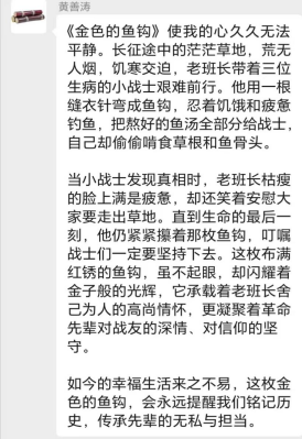 最后,黄善涛分享了杨旭的《金色的鱼钩》,他说:“如今的幸福生活来之不易,这枚金色的鱼钩,会永远提醒我们铭记历史,传承先辈的无私与担当。”