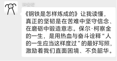 钟金宏分享了奥斯特洛夫斯基的《钢铁是怎样炼成的》,他说:“真正的坚韧是在苦难中坚守信念、在磨砺中锻造意志”。