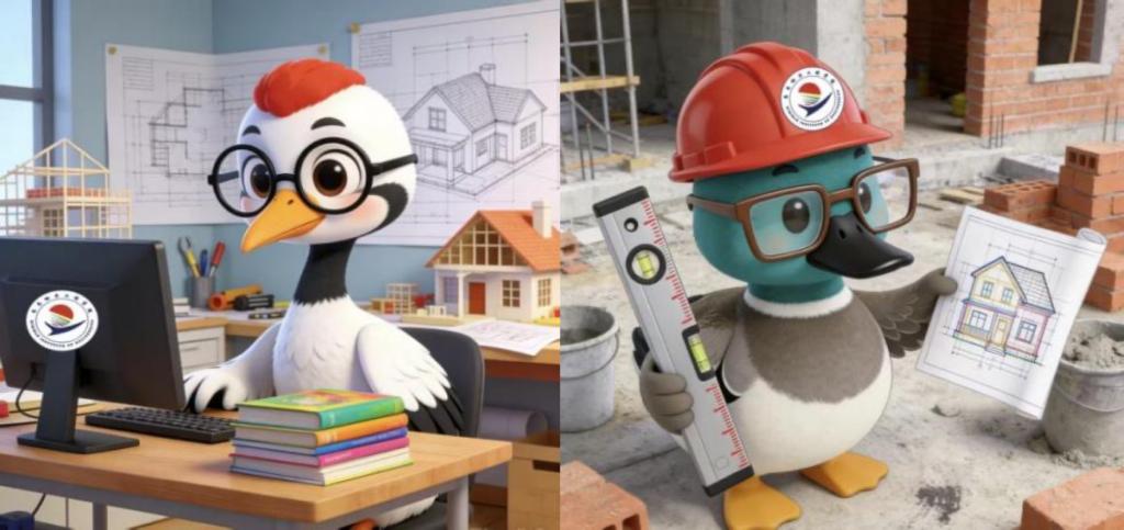 本次设计参考原研哉《设计中的设计》“文化融合”理念与聂洪达《房屋建筑学》中建筑结构设计的核心逻辑,以齐齐哈尔城市东方白鹳为核心元素设计校园吉祥物“小白鹳”采用白色色调,融入校徽,诠释工科院校的创新与实践精神,设计土木工程专业吉祥物“青头潜鸭”则以红安全帽,搭配水平尺、房屋设计图纸等元素,凸显专业“结构稳固、匠心筑造”的特质。