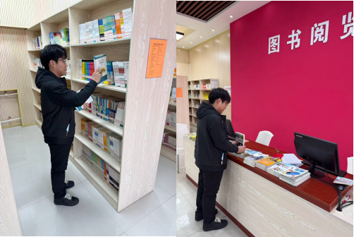 执勤结束后,荣双玉马不停蹄赶往校内图书馆,在管理员的指导下,有条不紊地开展书籍归位、架位核对、书架擦拭工作,还协助整理借阅登记台账,确保每一本书都能被快速检索。从晨光初照到暮色降临,他始终专注投入,指尖的书香与额头的汗珠,见证着默默付出。