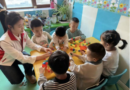 活动过程中,杜薇化身“玩伴”与“导师”,蹲在孩子们身边,手把手引导他们发挥想象。有的小朋友想拼一座高高的城堡,却总在搭建到一半时倒塌,杜薇便轻轻扶住积木,教他如何找准重心、稳固结构;有的小朋友偏爱拼搭各种交通工具,杜薇就和他一起构思车轮与车身的连接方式。教室里回荡着孩子们的欢声笑语,一块块零散的积木,在小手与大手的共同协作下,变成了形态各异的创意作品。