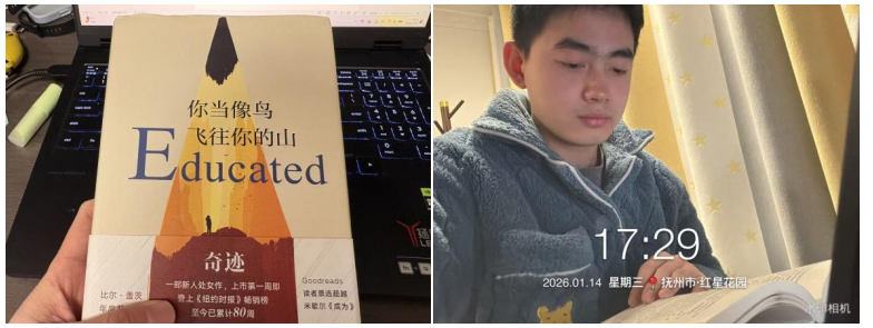 土木与管理学院互金251班胡宇鹏于2026年1月10日至1月14日居家研读《你当像鸟飞往你的山》,在文字中探寻教育与自我救赎的力量。