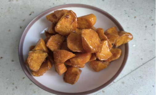 制作伊始,田赛康精选优质黄心地瓜,经切块、浸泡、沥干等预处理后,投入六成热的油锅中。通过“小火慢炸”与“高温复炸”的双重工序,地瓜块呈现出金黄酥脆的诱人质感。
