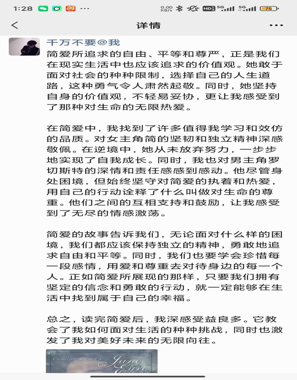 工管231班杜家兴同学本周进行读书分享会,阅读的书籍《简爱》。他分享主要围绕主人公独立自强的精神内核,剖析其冲破世俗枷锁、追求平等与尊严的人生选择,引发听众对自我价值与人生追求的深刻思考,现场交流氛围热烈。