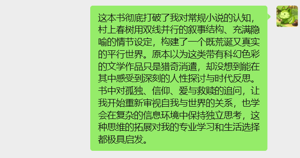 工管232班李承睿率先分享了《1Q84》的阅读体验。他坦言:“这本书彻底打破了我对常规小说的认知,村上春树用双线并行的叙事结构、充满隐喻的情节设定,构建了一个既荒诞又真实的平行世界。原本以为这类带有科幻色彩的文学作品只是猎奇消遣,却没想到能在其中感受到深刻的人性探讨与时代反思。书中对孤独、信仰、爱与救赎的追问,让我开始重新审视自我与世界的关系,也学会在复杂的信息环境中保持独立思考,这种思维的拓展对我的专业学习和生活选择都极具启发。”