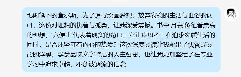工管232班徐文静分享《月亮与六便士》的阅读感悟。她说道:“毛姆笔下的查尔斯,为了追寻绘画梦想,放弃安稳的生活与世俗的认可,这份对理想的执着与孤勇,让我深受震撼。书中‘月亮’象征着崇高的理想,‘六便士’代表着现实的苟且,它让我思考:在追求物质生活的同时,是否还坚守着内心的热爱?这次深度阅读让我跳出了快餐式阅读的浮躁,学会品味文字背后的人生哲思,也让我更加坚定了在专业学习中追求卓越、不随波逐流的信念。”
