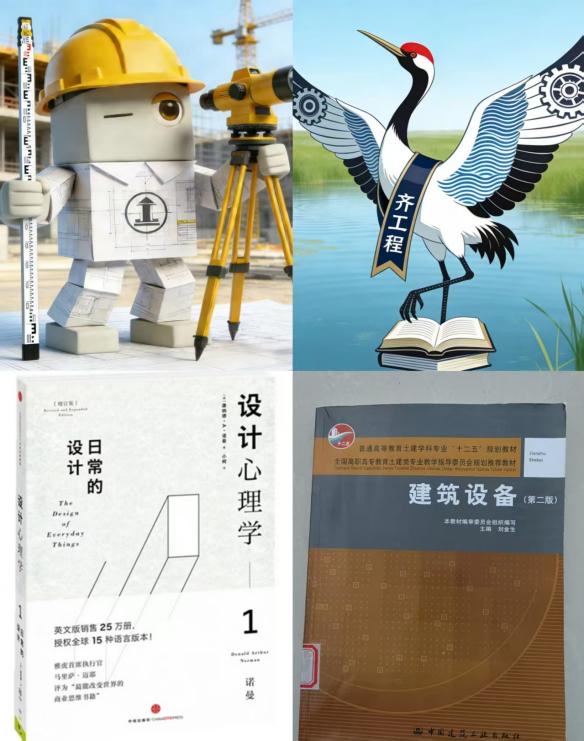 组员杨凯杰参考《符号与象征》人性化理念与《土木工程概论》智能建造逻辑,校吉祥物以齐齐哈尔丹顶鹤为原型,顶戴校徽、身嵌五角星,翅膀化教学楼轮廓,爪握钢笔、脚踩齿轮呼应知行合一,天蓝配白色显工科理性纯净;专业吉祥物砼小石以土木基石为形,刻“砼”字、带塔吊纹路,顶架小桥,配AI眼镜与测量机械臂,大地黄加灰色凸显专业稳固与智能。