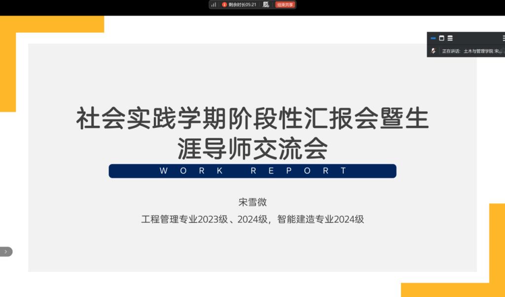为扎实推进社会实践学期,及时梳理阶段性成果、解决实践过程中出现的问题,同时搭建生涯规划交流平台,1月17日,辅导员宋雪微召开社会实践学期阶段总结会暨生涯导师交流会。全体生涯导师及工程管理专业2023级、2024级,智能建造专业2024级全体学生参会