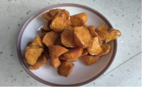 最考验功力的熬糖环节,他严格把控火候,待糖浆熬至浅琥珀色且能拉出细丝时,迅速倒入地瓜快速翻炒。刹那间,晶莹剔透的糖丝包裹着每一块地瓜,甜香扑鼻。