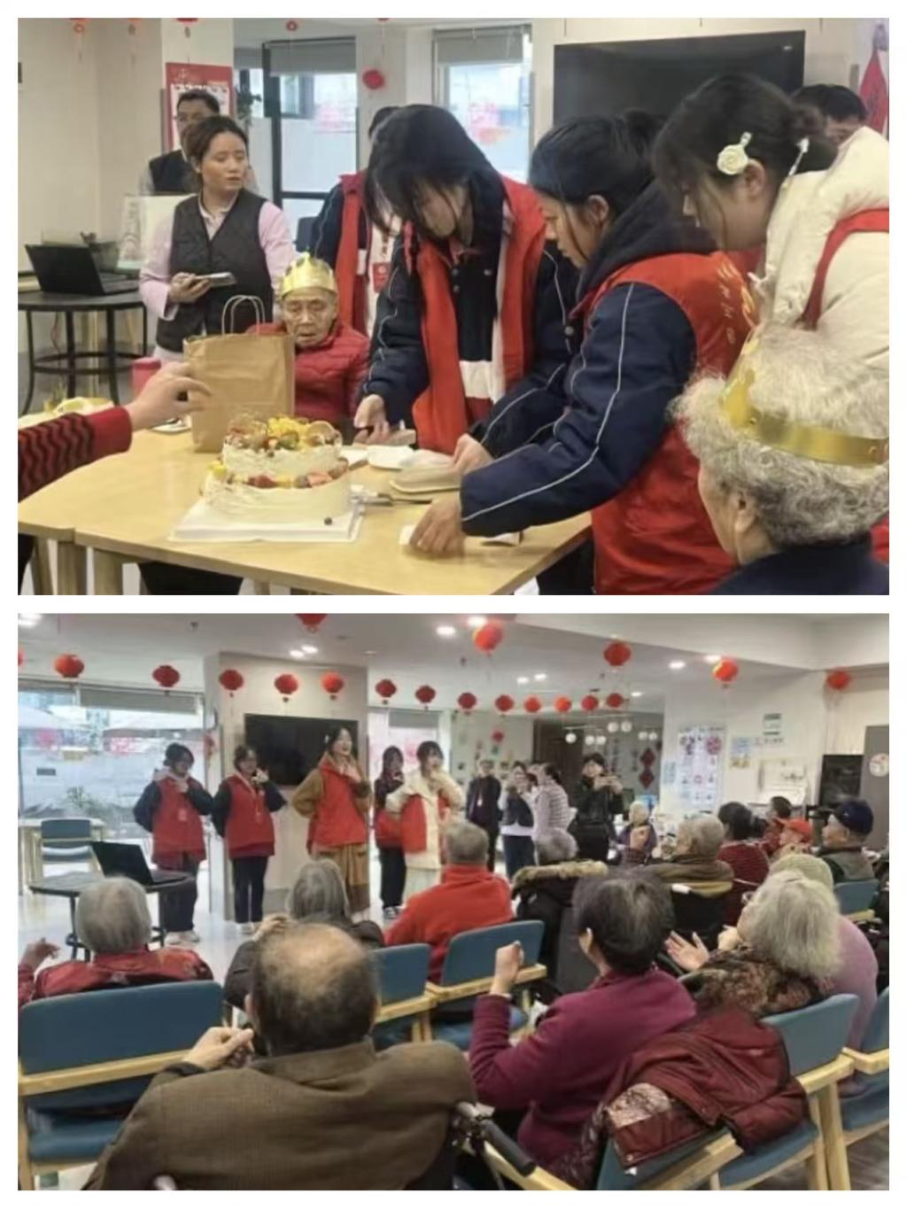活动现场,李欣蕊身着红色马甲,以一首温情的合唱拉开序幕,熟悉的旋律唤起老人们的美好回忆,现场掌声连连。随后,李欣蕊为当月过生日的老人举办集体生日会,共同切分蛋糕,送上真挚的生日祝福。老人们脸上洋溢着幸福的笑容,现场暖意融融。此次活动不仅丰富了老年人的精神文化生活,还让志愿者在陪伴老人的过程中收获了感动与成长,未来将继续传递这份温暖。