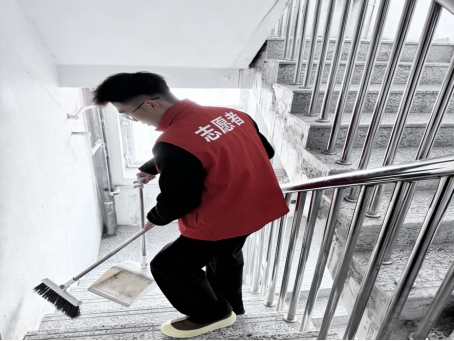 活动中,李雨潼身穿志愿红马甲,手持扫帚和簸箕,对居民楼的楼梯间进行了全面清扫。他仔细清理台阶上的灰尘、杂物,不放过任何卫生死角,以实际行动为居民营造了干净整洁的出行环境。