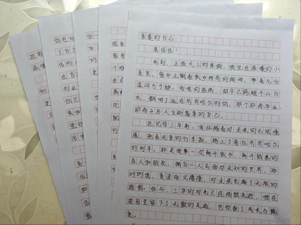 信中,刘罗响回顾初入大学时的青涩懵懂,细数大三学业的充实忙碌,也坦诚面对迷茫与挫折的心路历程。并围绕过往成长、当下奋斗、未来期许三方面展开,既肯定了三年来的蜕变,也表达了对未来职业与人生道路的憧憬,更叮嘱自己坚守初心、保持学习热情,珍惜身边亲友。