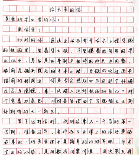 孔维静心梳理当下的专业学习感悟,将未来的学业规划与职业理想落笔成文。信中明确了备考初级会计证、提升财务专业技能等具体目标,更立下坚守财务管理“诚信审慎”职业准则的初心,字句间满是对成长的期盼与对专业的笃定。