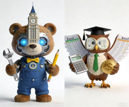 苏艳红研读《设计中的设计》与《财务管理(第9版)》书籍汲取专业灵感,借助AI技术实现创意落地。“机械小熊”以齿轮肌理为核心,憨态外形搭配金属纹路,凸显学校工科实践底色与温暖育人氛围;“智能猫头鹰”则以数据网格为羽翼,融入财管专业逻辑,象征精准分析与前瞻决策能力。