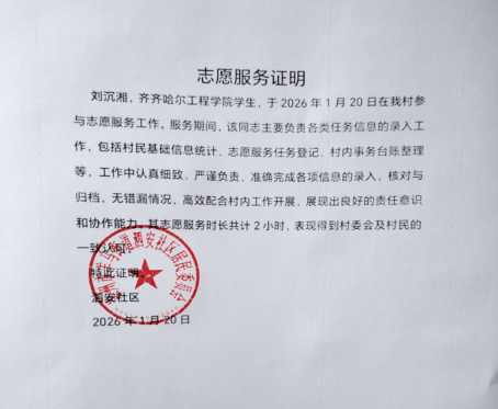 此次志愿活动,不仅展现了刘沉湘同学吃苦耐劳、乐于奉献的优良品质,更体现了工程造价专业学子将专业能力与社会实践相结合的责任意识。土木与管理学院始终鼓励学生立足专业特色服务社会,引导青年学子在实践中增长才干、锤炼品格,以青春之力赋能乡村振兴与基层治理现代化。