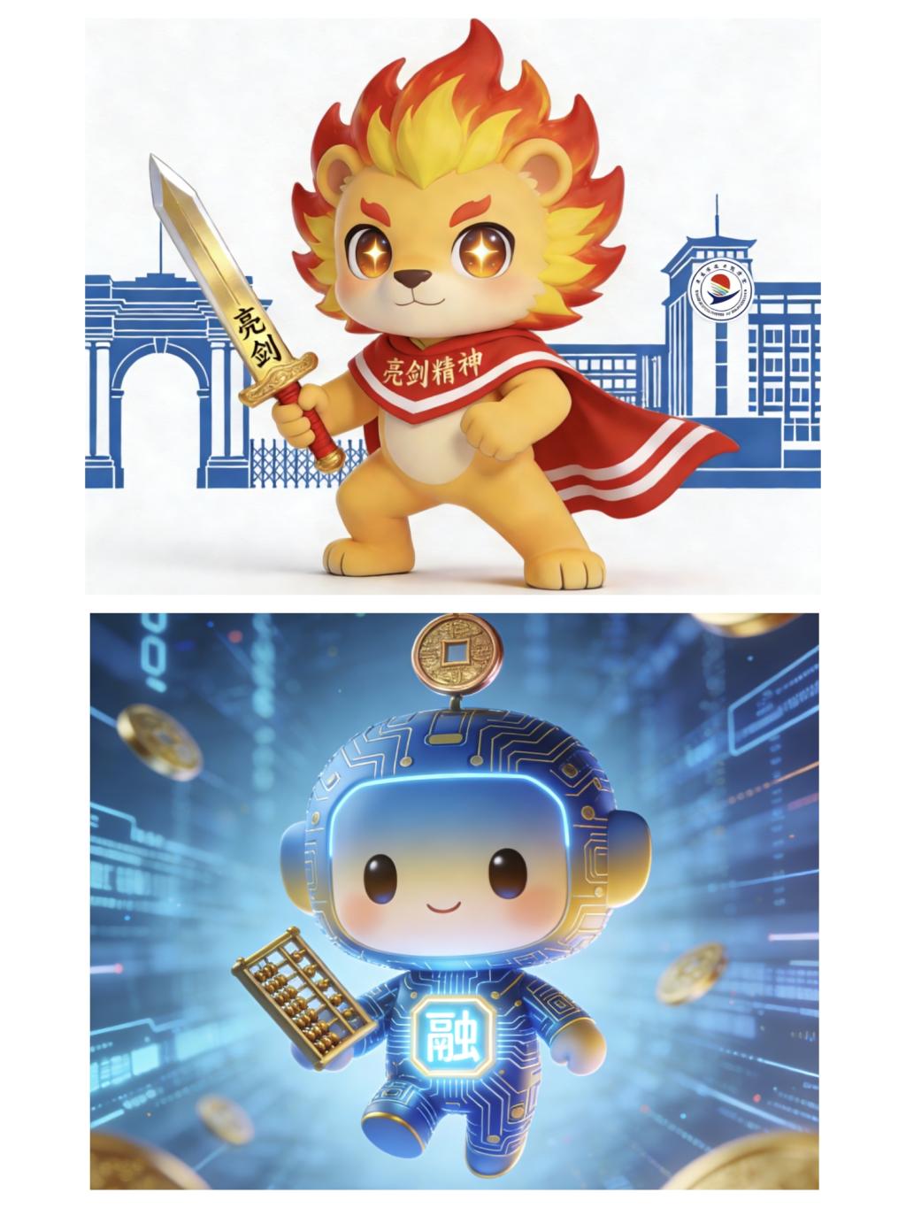 王静雯设计的亮剑狮以战斗姿态为后方的校园保驾护航,披风上的“亮剑精神”字样,强化了精神符号的传递,红色也代表热血、忠诚与使命感;金小码的铜钱、算盘、金币代表金融行业的财富管理、风险计算与支付结算,芯片、数据流体现互联网金融的数字化、智能化与技术驱动特性营造出数字金融的未来感,传递出敏捷前行、探索未知的专业精神,契合互联网金融行业快速迭代、不断突破的特质。