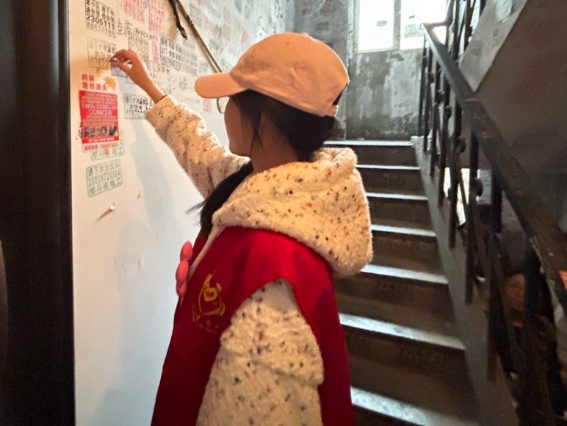 活动当日,佘禄轩与志愿者们在街道办事处集合,领取铲刀、喷壶等工具后分组行动。针对辖区楼栋墙面、扶手、电表箱上的“城市牛皮癣”,志愿者们采用“喷湿软化—精准铲除—残留擦拭”的方式,逐楼逐层清理,不放过任何隐蔽死角。面对顽固胶印,大家互相配合、分享技巧,高效推进清理工作。
