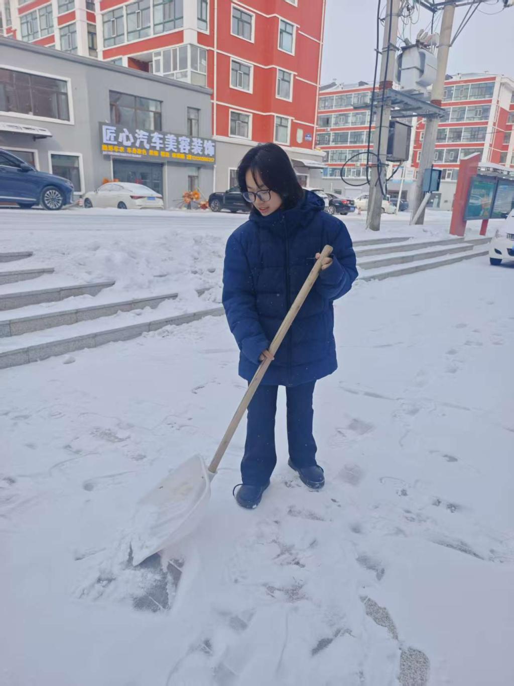 活动现场,李唯畅和志愿者们手持铁锹、雪铲、推雪板等工具,以分组协作的方式展开清雪作业。不畏严寒、分工明确,有的奋力推雪开辟通道,有的挥锹铲冰清理死角,有的仔细清扫路面残留积雪,齐心协力配合默契。凛冽的寒风中,李唯畅的额头却渗出汗水,过往市民纷纷驻足点赞,不少热心居民也主动加入清雪队伍,形成了“志愿带头、全民参与”的暖心画面。