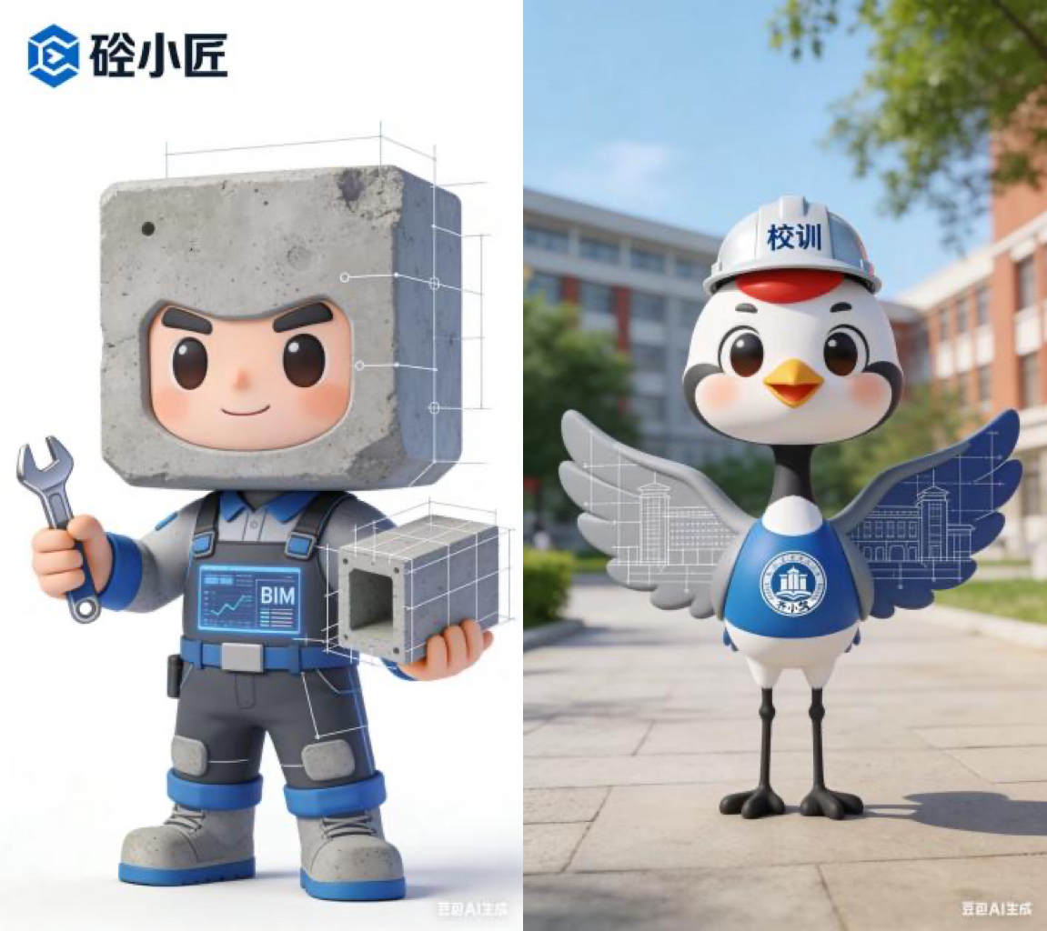 她以《建筑美学基础》里的“功能与美学统一”理念为指引,提炼土木工程“精工筑造”的特质;借《AI创意设计入门》的数字创作逻辑,融合齐齐哈尔丹顶鹤元素与专业符号:校园吉祥物“齐小筑”以丹顶鹤为形,翅膀绘建筑蓝图、头顶缀微型安全帽;专业吉祥物“砼小匠”以混凝土构件为底,配BIM技术元素与工装造型,既显地域&校园特色,又彰专业内核。