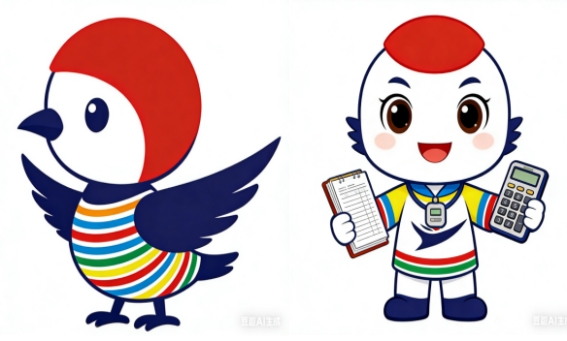 此外,胡怡同学还设计了吉祥物。学校吉祥物“领航鹤”:头顶融入校徽元素,身披藏蓝扬帆披风,以鹤城之鹤为原型,彰显学校逐浪领航、蓬勃向上的精神。专业吉祥物“财智豚”:头顶红日造型智慧金币,手持算盘与报表,以圆润豚形体现财管专业严谨细致、赋能发展的特质,马甲上的扬帆纹样呼应校徽元素。
