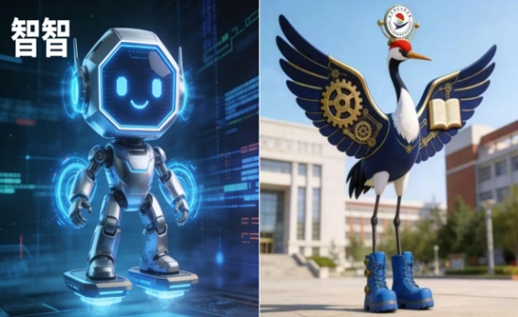 左边的“智智”机器人带着科技的冷冽与灵动,周身流转的蓝光是智能的脉搏,代表着学院在智能建造领域的前沿探索;右边的机械丹顶鹤则衔着书卷、身披齿轮,脚下的潮酷蓝靴与身后的教学楼呼应,将鹤城的城市精神与校园的人文底蕴、工科基因巧妙融合。它们共同成为齐齐哈尔工程学院学子探索智能建造、扎根地方的精神图腾。