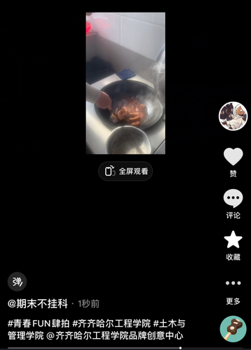 焦宇衡凭借细腻的观察与鲜活的镜头语言,从三餐烟火的温暖、做饭日常的鲜活,到生活细碎的美好等多个维度,为观众呈现了真实且治愈的生活片段。用镜头传递温暖与热爱,鼓励大家发现生活中的小确幸,以积极的态度拥抱日常。在此过程中,也展现了齐齐哈尔工程学院学生对生活的热忱与细腻感知。。